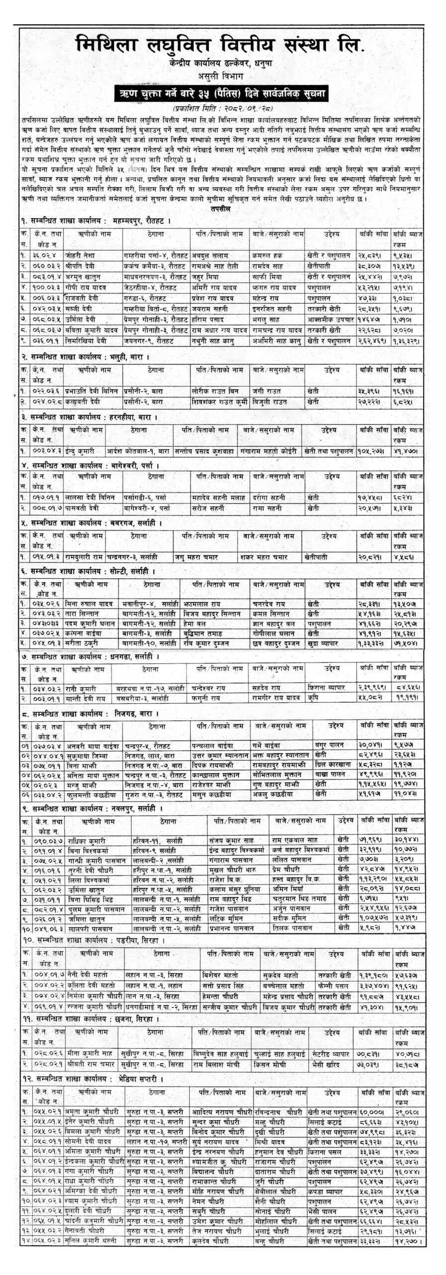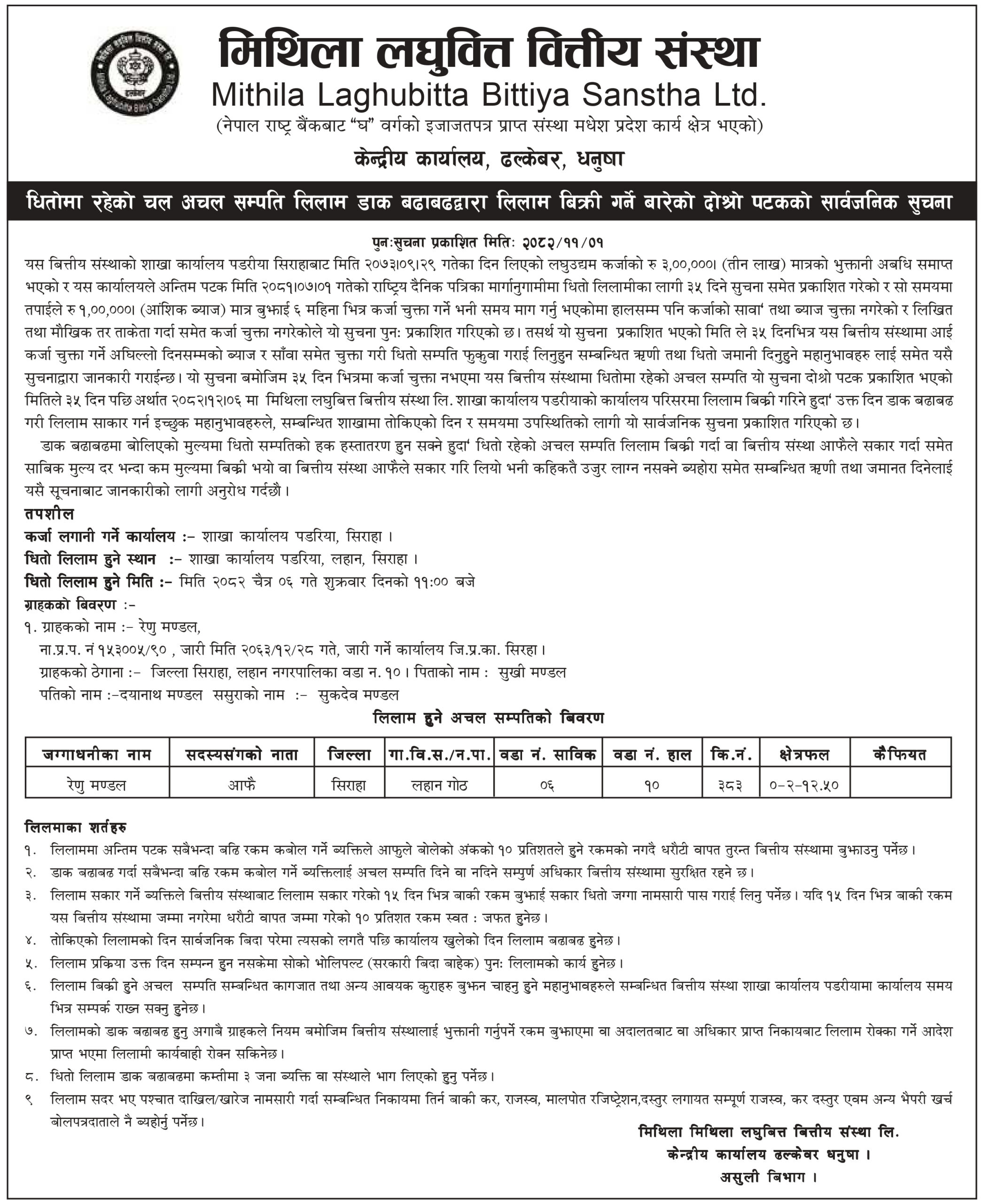 Mithila Laghubitta Bittiya Sanstha Ltd. is registered under the "Company Act 2063" with the Company Registrar's office of Nepal as a micro-finance institution in Dhalkewar, Dhanusha district. The registered code number of this organization is 1093/065/066 dated June 7, 2018 (2075.02.24 Bikram Era). Mithila came into existence in Dec 22, 2008 (2065.09.07) with the establishment of its central Head office at Dhalkewar in Mid-Eastern Region of Nepal. The Nepal Rastra Bank (NRB) has given the license for operating the transactions. The license number is "D" 073/49/04